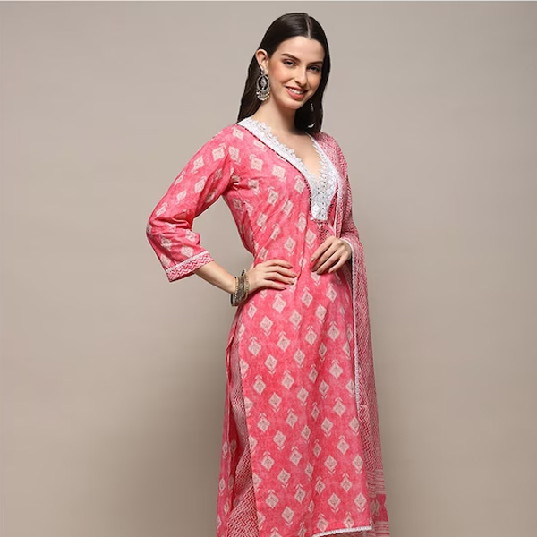 Pink printed kurta fabric, lace detail